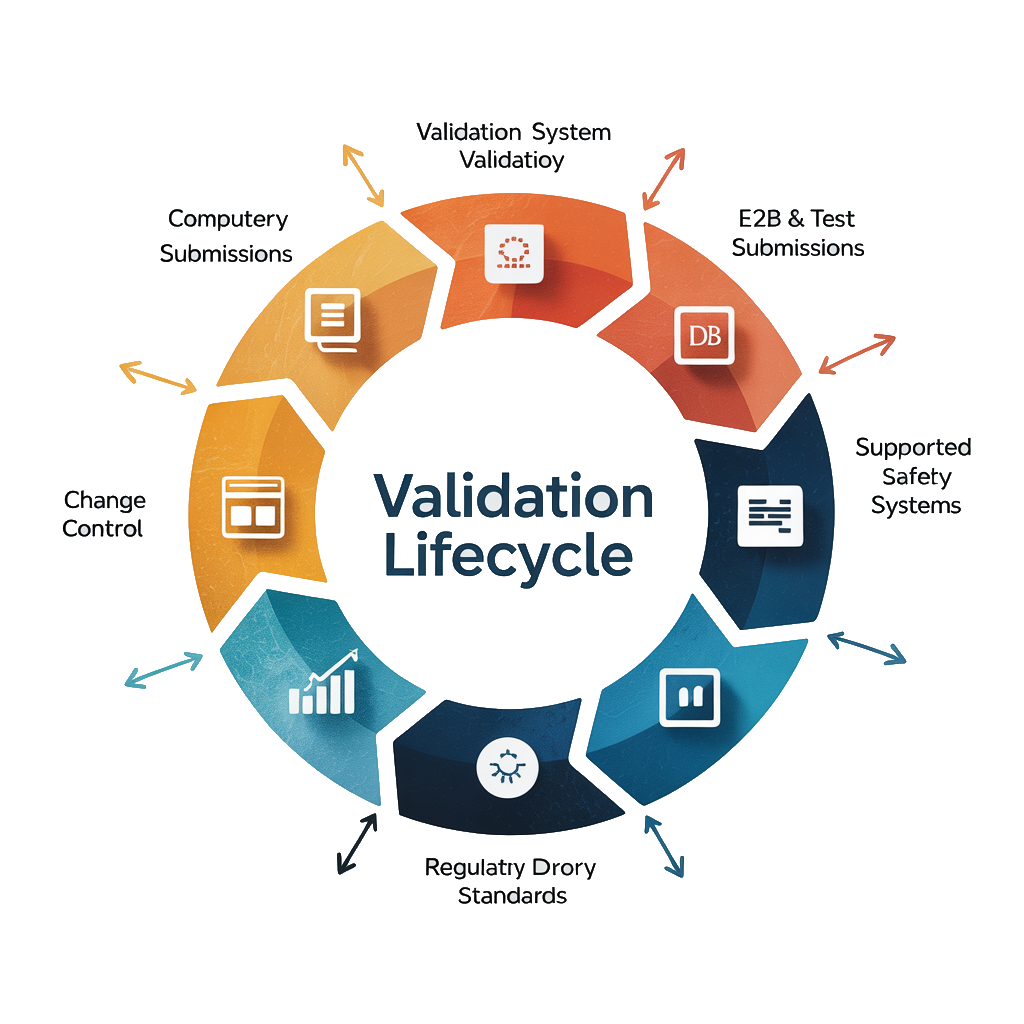 We validate systems like Argus, ARISg, and Veeva through a full CSV lifecycle—including URS, FS, Risk Assessments, and IQ/OQ/PQ protocols—to meet global standards.